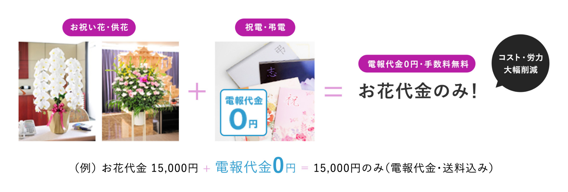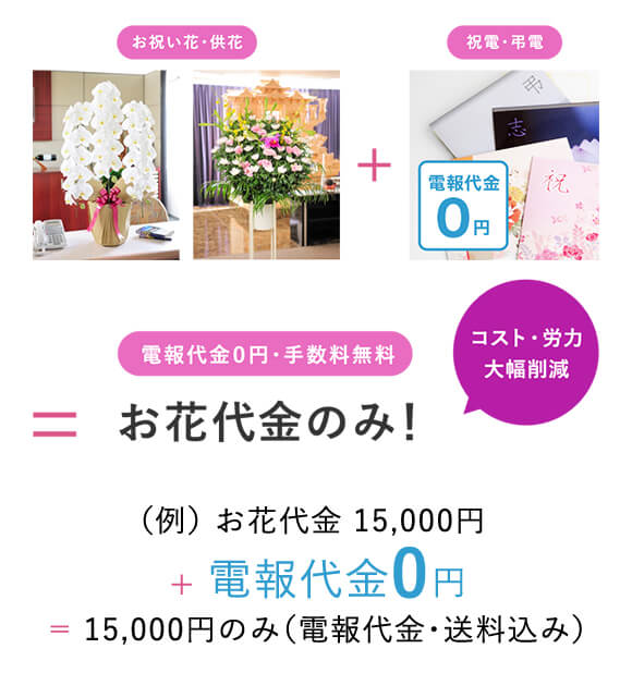 ビジネスフラワー®の電報(祝電・弔電)は無料です。1回のお申し込み手続きでお花と電報を同時に注文いただける総務省認可「特定信書便事業許可」を受けた安心のサービスです。