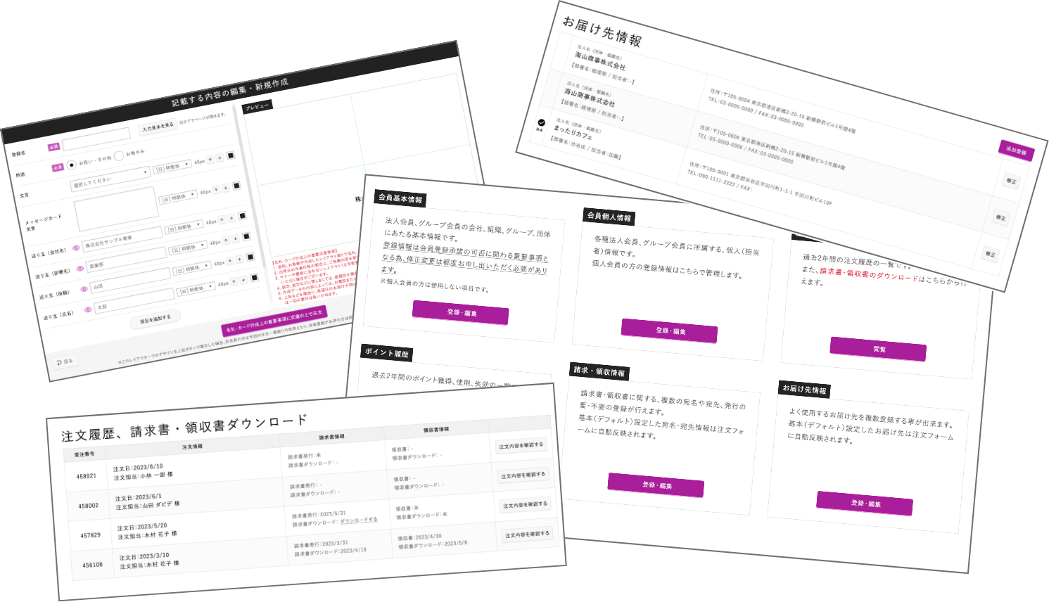 いつも利用するお届け先の登録、立札やメッセージカードのレイアウト保存、請求先の登録、請求書や領収書の発行・印刷、Webカタログギフトの利用、購入するたびに貯まるポイントなど…たくさんの機能をご用意しております。