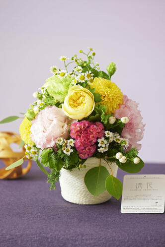 年間数千個のフラワーアレンジメントをお客様のもとに丁寧に丁寧に贈りだし続ける実績と、西名美和子のゆずれない素材へのこだわり、ぶれない技術、妥協しないクオリティから生み出される気高く、高級感溢れるデザインはシーンを選ばずお贈りいただける。