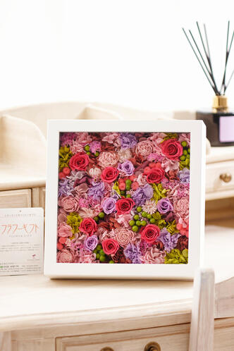 - プリザーブドフラワー glass box(白/スクエア)パープル&ピンク