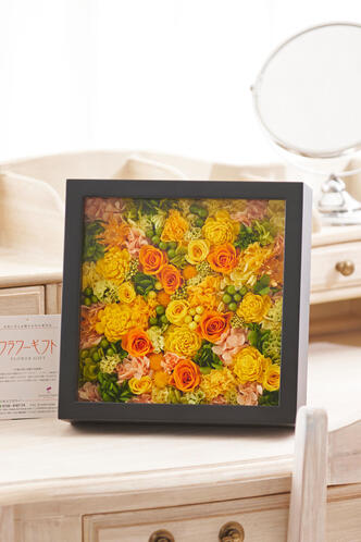 - プリザーブドフラワー glass box(黒/スクエア)オレンジ&ブラウン