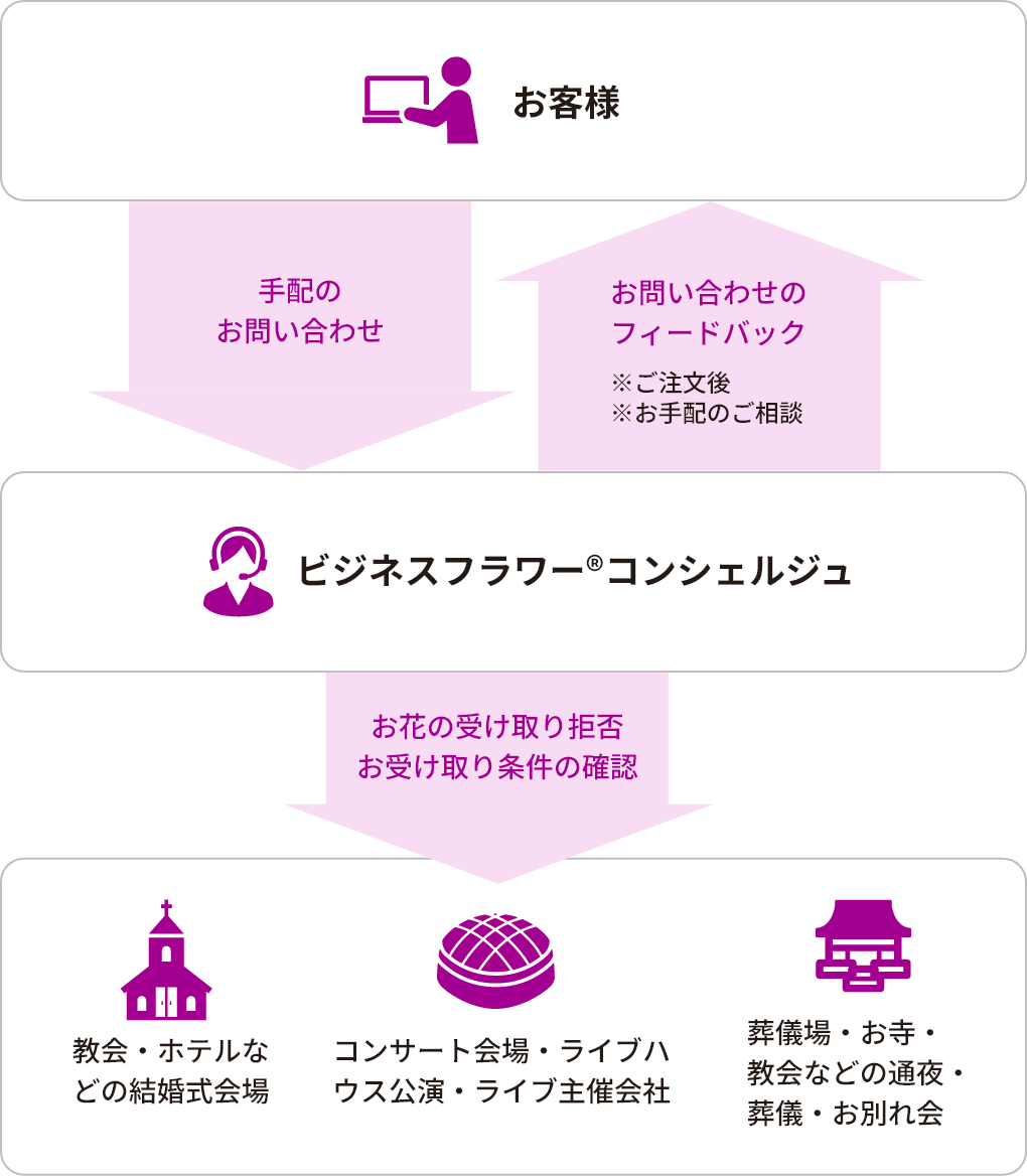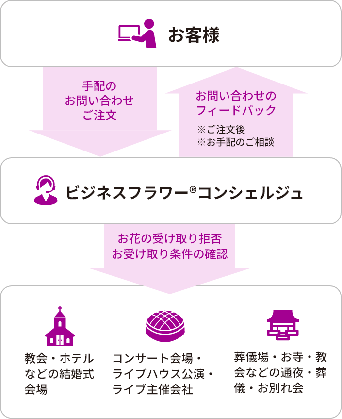 豊富な商品知識と経験により、お祝いやお供えなどのお花選び、ライブや結婚式、ご葬儀などのお花の持ち込みに関わるセッティングから、冠婚葬祭のマナーに至るまで、ビジネスフラワー®コンシェルジュがお手伝い致します。