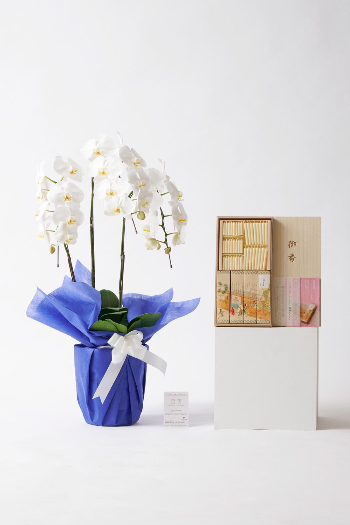 尚、お申込み日当日にお届けができる供花胡蝶蘭や、供花胡蝶蘭と弔電がセットになった商品の他、お供え用胡蝶蘭とお線香がセットになった商品もご用意しております。